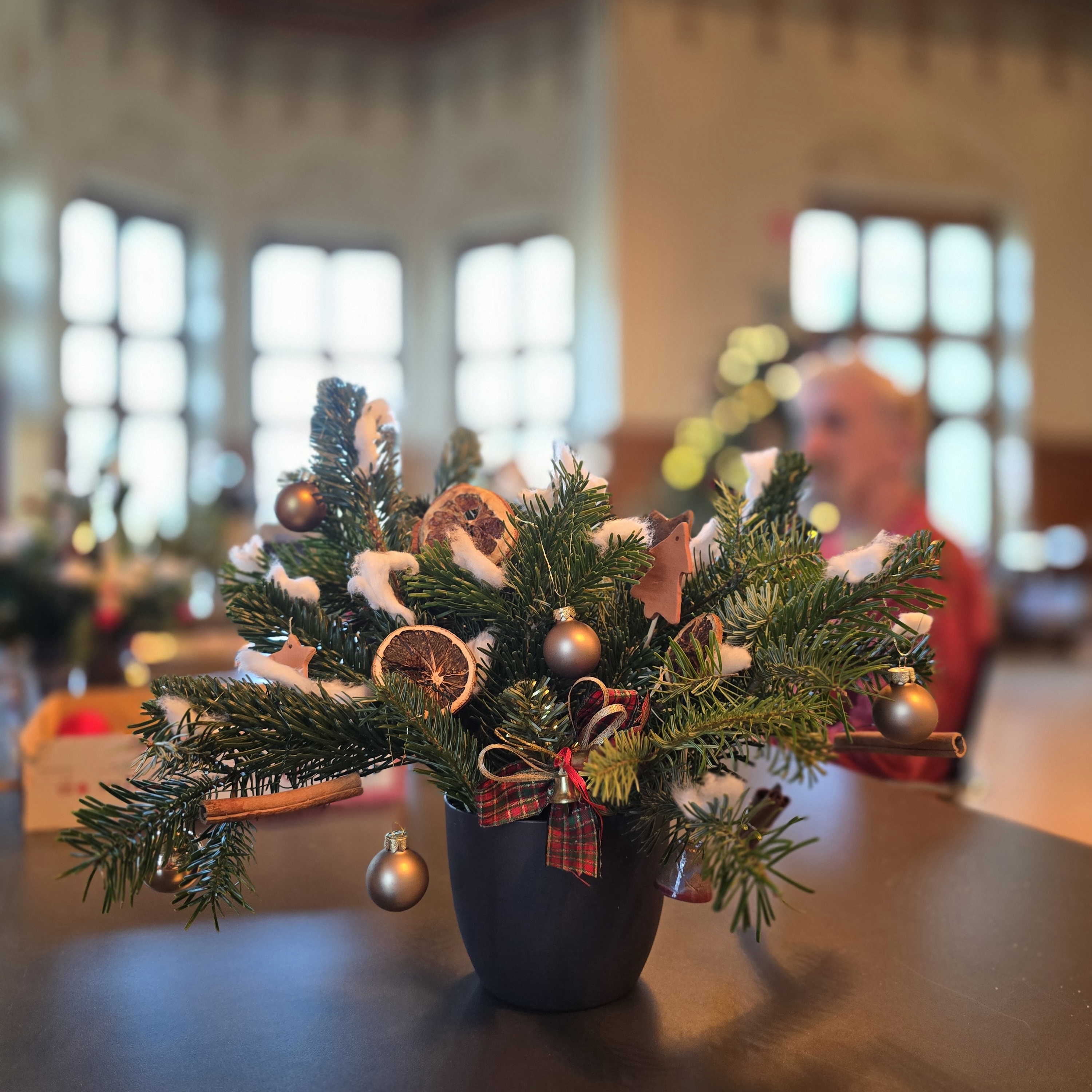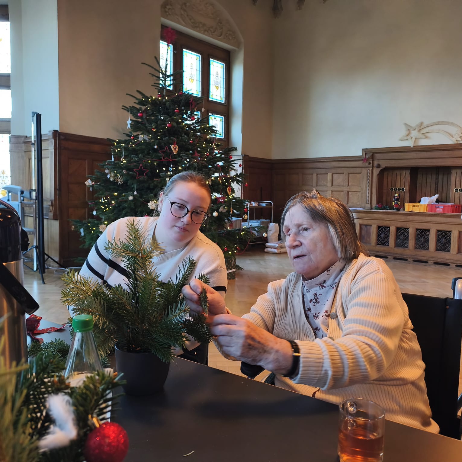 Mit frischen Zweigen, bunten Bändern und funkelndem Christbaumschmuck entstanden so liebevolle Arrangements. Bei Weihnachtsmusik, Lebkuchen, Punsch und Früchtetee tauschten Groß und Klein viele Geschichten rund ums Fest.