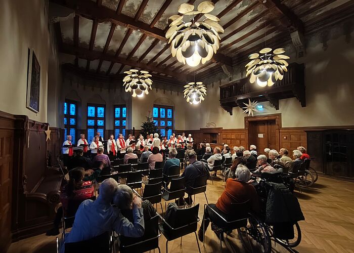 Im festlich geschmückten Saal des Altenpflegeheims Riebeckpark gastierte am 7. Dezember 2025 der Volkschor Reideburg e.V. Die Sängerinnen und Sänger erfreuten ihr Publikum mit weihnachtlichen Weisen und sorgten so stimmgewaltig für eine Stunde Vorfreude. Schön war es!