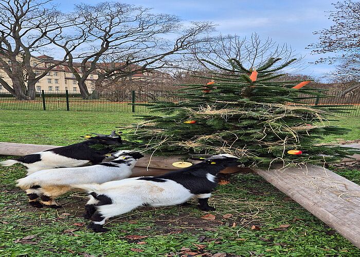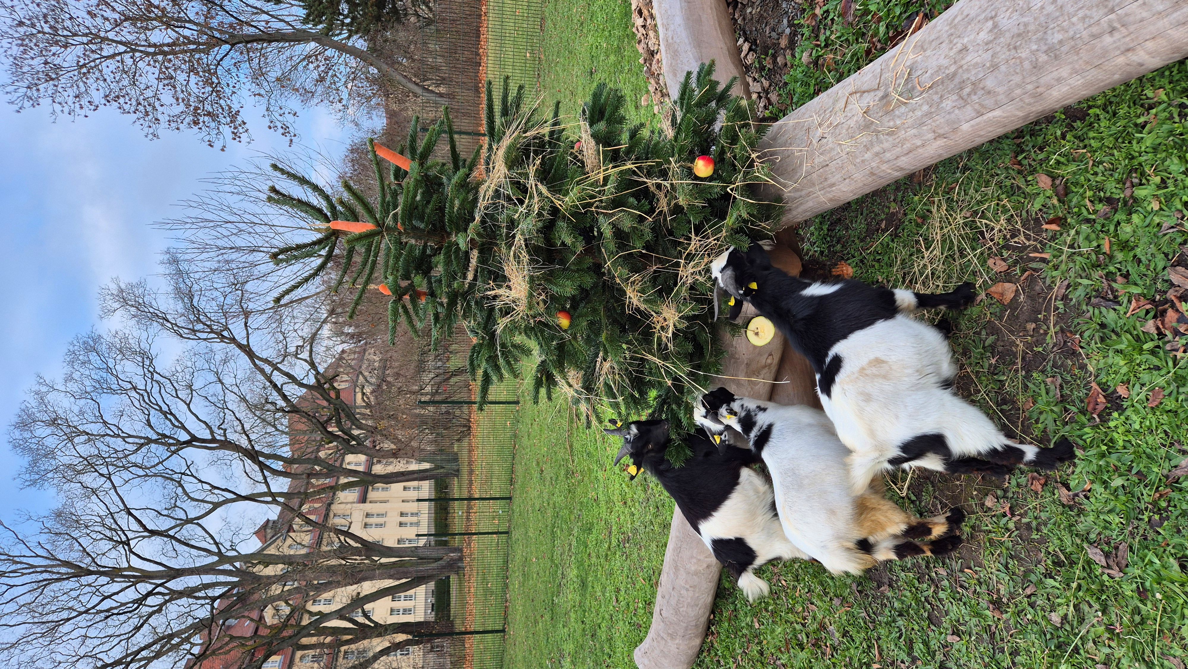 Nicht nur unsere Bewohnerinnen und Bewohner sind inzwischen so richtig in weihnachtlicher Stimmung, auch bei unseren Zwergziegen wurde heute festlich aufgetafelt. Eine kleine Tanne mit Stroh statt Lametta, Äpfeln als Kugeln und drei großen Möhren als Kerzen dekoriert nun das Gehege der Vierbeiner. Freilich nicht lange, denn die drei tierischen Mitbewohner hatten diesen Adventsgruß zum Fressen gerne… Machen auch Sie sich ein schönes Adventswochenende! Die Paul-Riebeck-Stiftung wünscht allen Bewohnern, Mietern, Partnern, Mitarbeitern und Freunden sowie deren Angehörigen einen behaglichen dritten Advent.