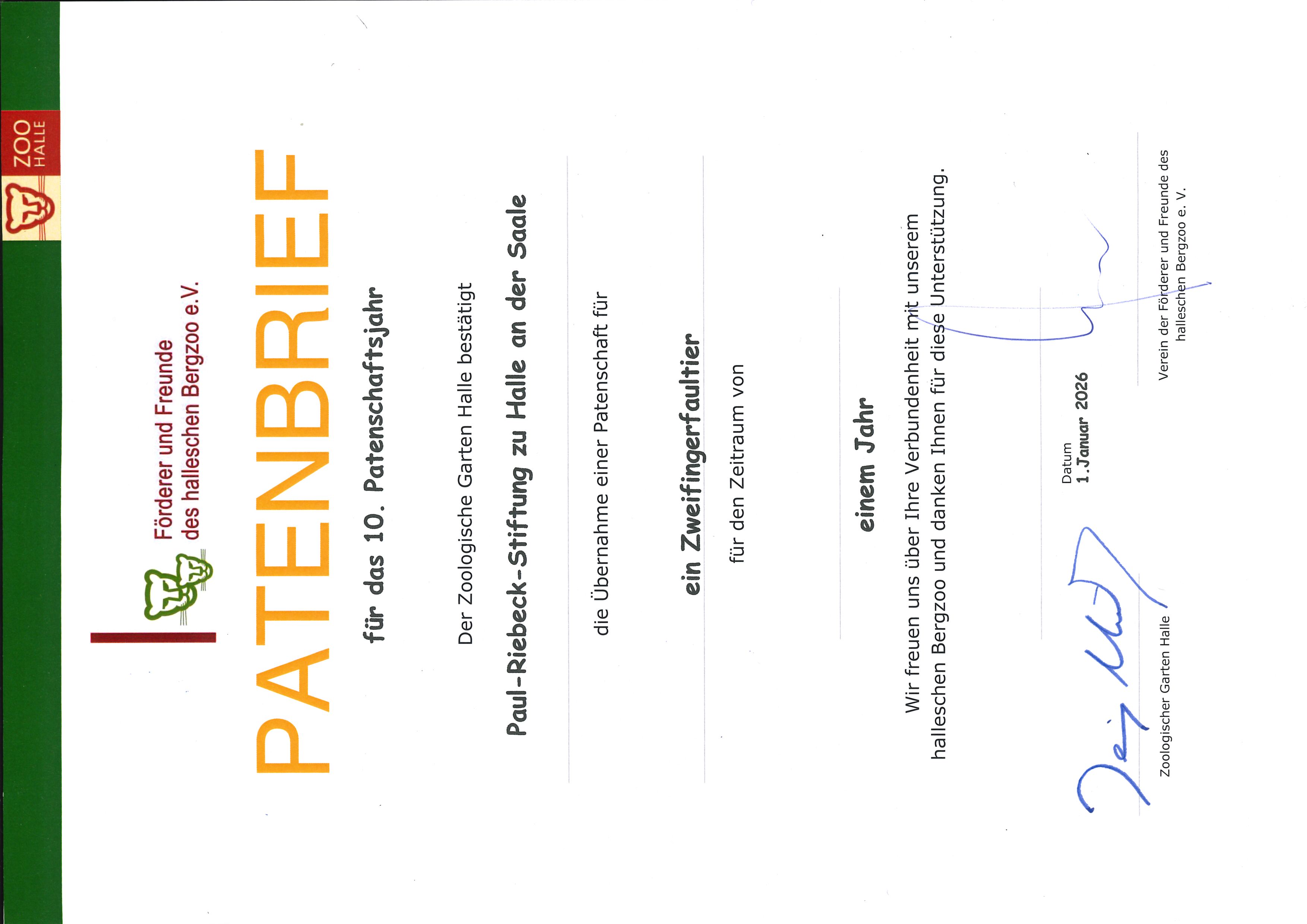 Die Paul-Riebeck-Stiftung bleibt dem Bergzoo Halle treu und hat ihre Tierpatenschaft um ein weiteres Jahr verlängert. Was vor neun Jahren mit der Faultier-Legende Paula begann, ist inzwischen eine schöne Tradition für ihre Artgenossen geworden: Auch in diesem Jahr gibt es wieder frisches Obst für die gemütlichen Energiesparmeister.